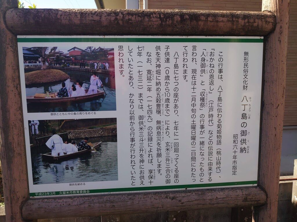 薩摩街道に沿う八丁島は三井郡の経済的な中心であった。御供納は梅林寺山麓の池で行われてきた祭事と同じ内容である。筑後川を舞台として活動していた尼御前たちが大刀洗川をさかのぼり、この地で行っていた水神祭りが現在まで残った。尼御前は水神祭りに関わり護符を授けながら平家伝説を語ったが、その多くは失われてしまった。現在は池王(大蛇)への人身御供と収穫祭に起源があると考えられているが本来は水神と尼御前に由来する(というのが古賀先生の説)。