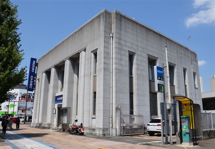 旧第一銀行久留米支店は大正15年の建築。第一銀行本店などをてがけた西村好時氏の設計・清水組の施工による鉄筋コンクリート造2階地下1階建の建物です。いわゆる銀行建築様式で、窓が小さく、太い縦の柱を強調しているのが特徴(東京の三井本館・名古屋のUFJ貨幣資料館などが典型的な銀行建築様式)。新築記念資料には「鉄骨鉄筋コンクリートで絶対耐震耐火を主眼とす」と記載されています(3年前に発生した関東大震災が念頭に置かれていた)。三本松町通りは昔この建物の東側を通っていたので建物は東を向いて建っています。戦後区画整理で道が西に付け替えられたため、建物が道に背中を見せているのです。現在「みずほ銀行」も営業を終了しています。