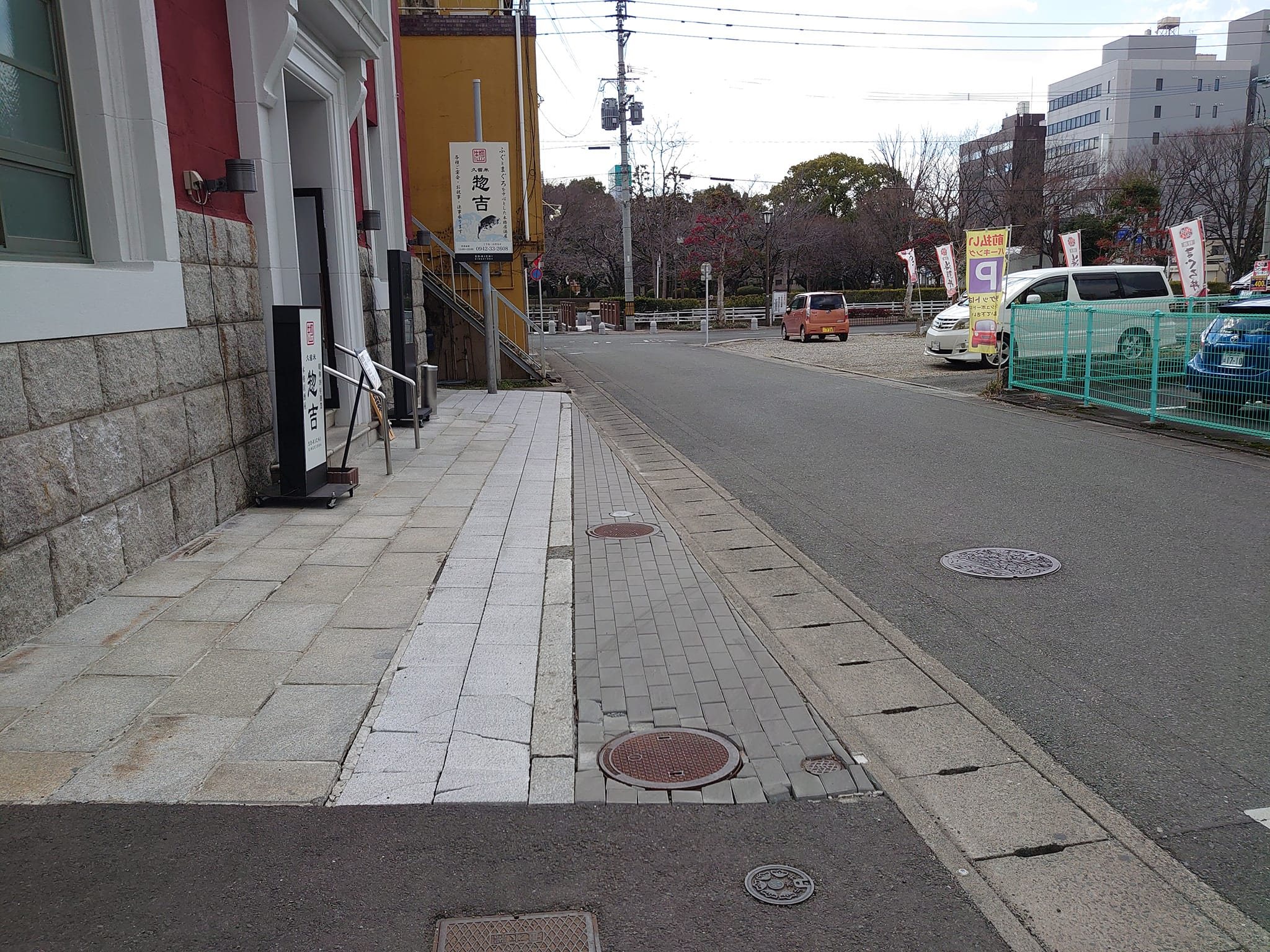 南側に「紳士服のフタタ」があります。三本松町通りはこの駐車場を貫通します。駐車場を抜けて南に数十メートル分だけ昔の面影が残されています。三本松町通りが繁華街であった証拠に道の両側に銀行がありました。東に一七銀行・西に第一銀行です。三本松町通りは久留米空襲で焼け野原となりましたが、木造でなかった2つの銀行建物は今もなんとか生きながらえています。