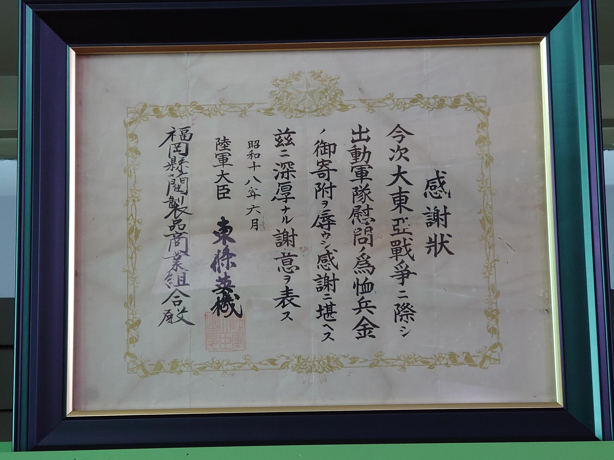 なんと!時の陸軍大臣(後に首相)東條英機が署名した感謝状もあります。