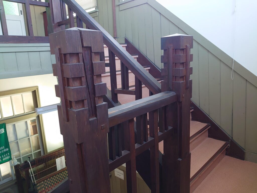 久留米から柳川に向かう県道(旧柳川往還)沿いに小さい洋風の木造建築があります。八丁牟田の信号を通り過ぎて右手にあります。い草を扱う業者3団体の会館です。(*2026年2月17日、久しぶりに訪れて内部の写真を撮らせていただきました・本稿は改訂版です。)。