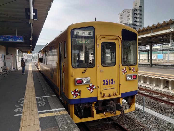 諫早駅で新幹線「かもめ」を降りて島原鉄道に。黄色い電車(一両編成)に気分が上がる。