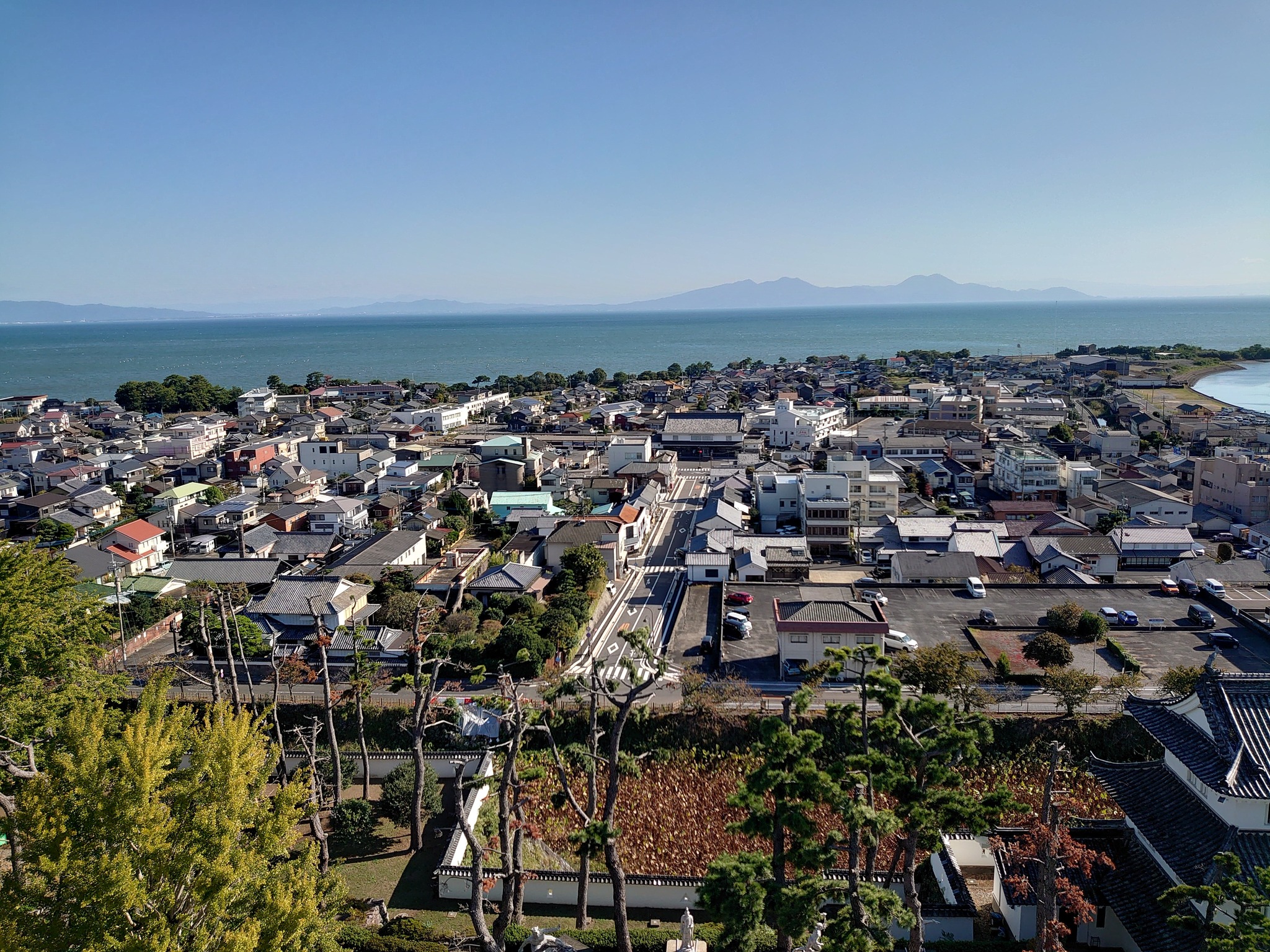 西側の風景。島鉄島原駅の向こう側は有明海。対岸は熊本県。