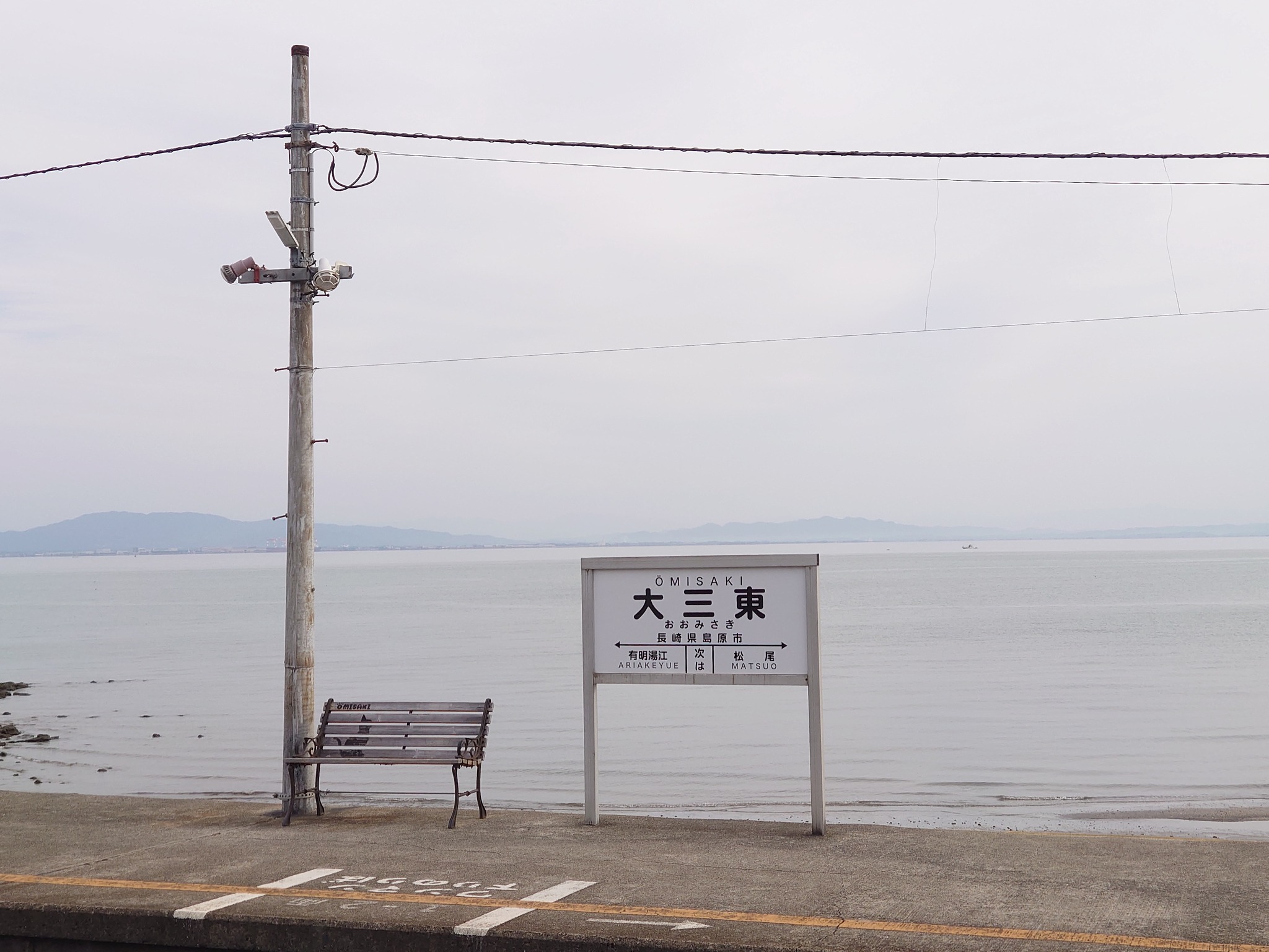 最初の目的地「大三東」駅。曇っていて干潮時だったので写真の映えが今ひとつ(涙)。
