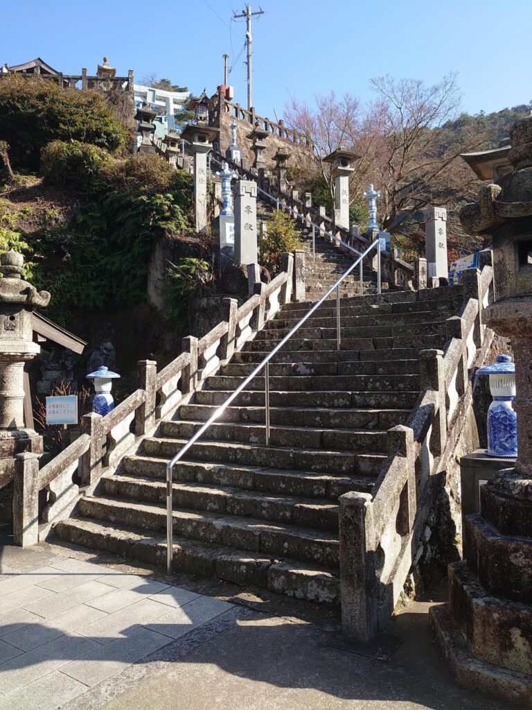陶山神社。磁器で作られた灯篭が美しい。直ぐ前をJR線路が横切るのも面白い。