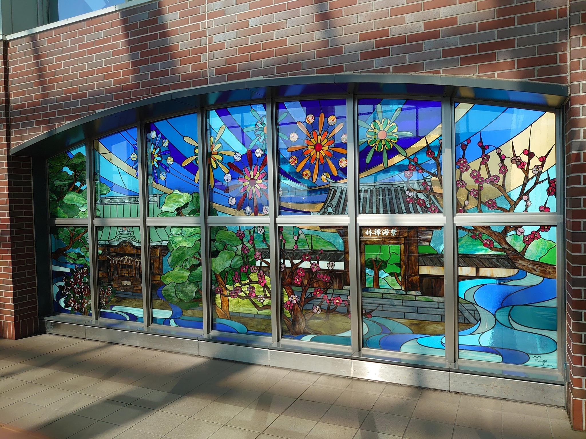 JR裏口の勧め。昔の国鉄駅は表口と裏口に著しい差異がありました。久留米も例外ではなく裏口は少し寂しい。けれども裏口にこそ文化的蓄積があります。歩いて10分圏内に文化財が一杯。ステンドグラスは梅林寺・水天宮を中心に筑後川花火大会と梅と久留米ツバキで彩られています。