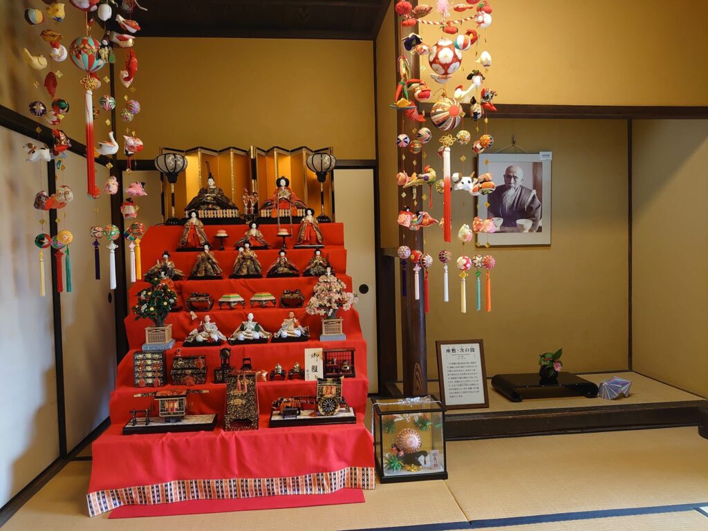 春には見事なひな祭りの飾りが展示されます。床の間に遺影があります。