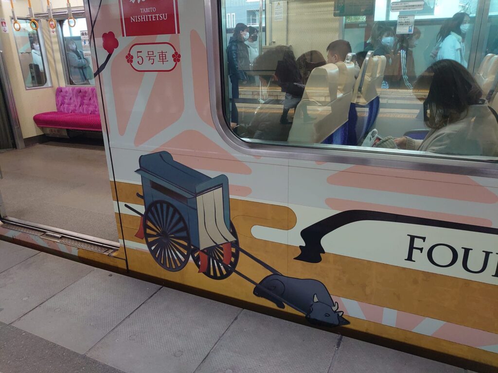 久留米版徒然草 Vol.335 2026年3月14日 / 最終更新日 : 2026年3月14日 webmaster 運が良い列車 西鉄の観光列車「旅人」。これにあたると運が良い。 デザインイメージの「太宰府天満宮本殿」が描かれています。 その原型としての「菅公を乗せた牛車が動かなくなった」図です。 「旅人」ではひとときの「雅な時間」を楽しみましょう。